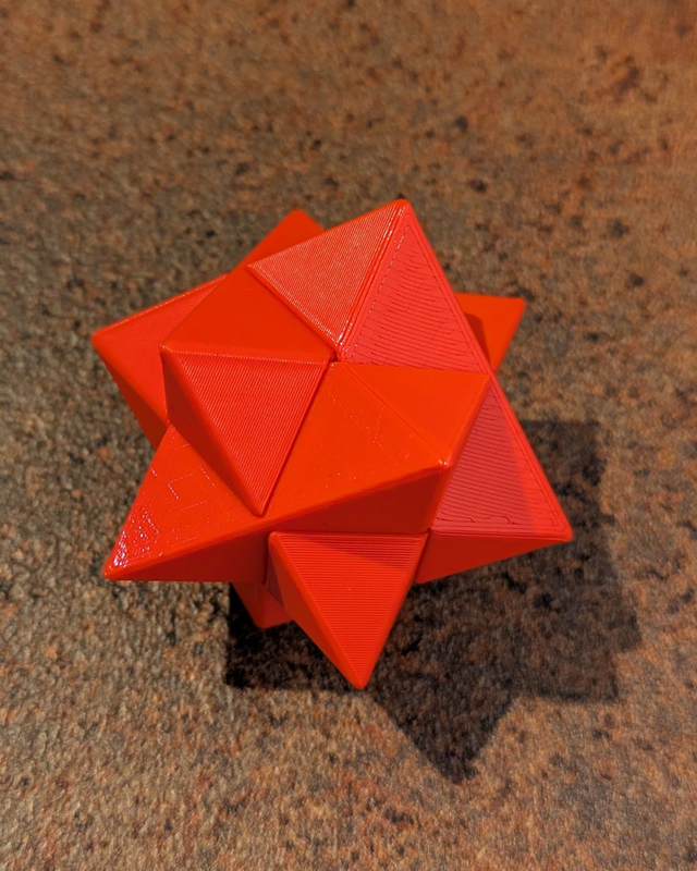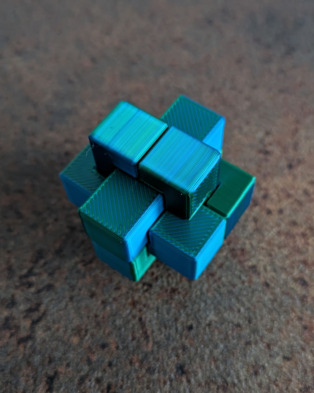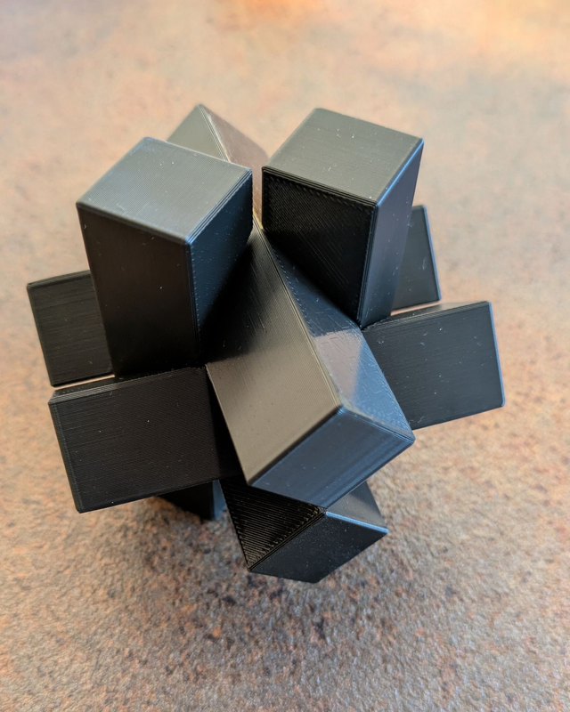 Ein Set aus den 5 Rätsewürfeln: Teufelsknoten, 6 Teiliger Teufelsknoten, Stern, Kreuz und Asteroid
