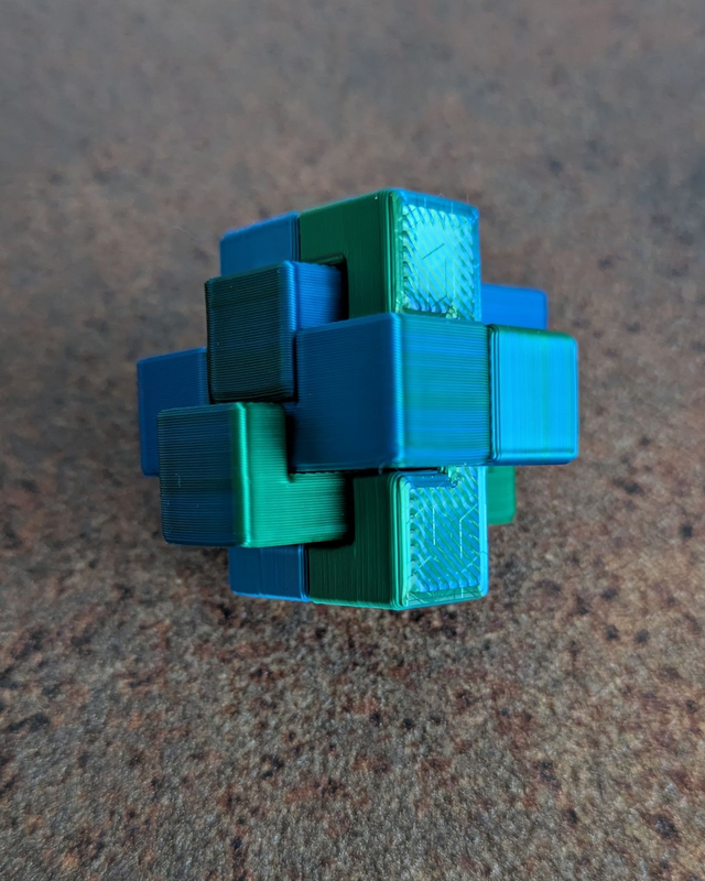 Ein Klassiker unter den Rätselwürfeln: der Teufelsknoten. Hier eine Variante aus 6 Teilen. Schon deutlich schwerer zu lösen als sein kleiner Bruder aus drei Teilen. Größe ist etwa 4x4cm Zusammengebaut.